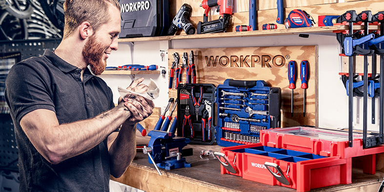WORKPRO, potente marca que viene a irrumpir en todas las ferreterías del país, con un mix de más de 100 productos diferentes, de gran calidad y precio, con un excelente formato de presentación. Su oferta considera una interesante profundidad de productos que van desde martillos, serruchos y alicates, pasando por una completa gama de juegos de destornilladores, juegos de puntas, llaves, formones, limas, incluyendo herramientas de precisión como pie de metro (análogo y digital), niveles, entre otras, hasta llegar a completas cajas de dados y herramientas, y maletines porta herramientas.